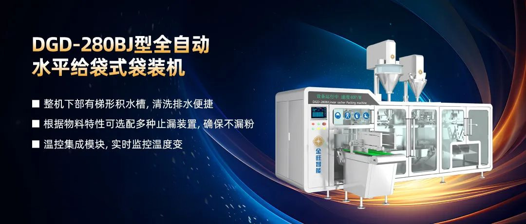 金旺智能DGD-280AJ全自動水平給袋式袋裝機為金旺智能新研發在線稱重式袋裝機。在PLC的可編程控制下,實現了由取袋→開袋→檢測→充填1→預稱重→充填2→封口→成品的功能。
