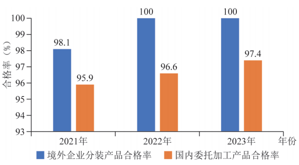 圖1 農(nóng)業(yè)農(nóng)村部2021—2023年農(nóng)藥監(jiān)督抽查境外企業(yè)分裝產(chǎn)品和國(guó)內(nèi)委托加工產(chǎn)品合格率對(duì)比