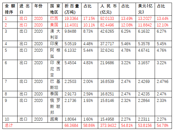 出口前十的國家占總出口的一半多。2020年,出口最多的是巴西和美國,占總出口數量的27%,總出口金額的25%。
