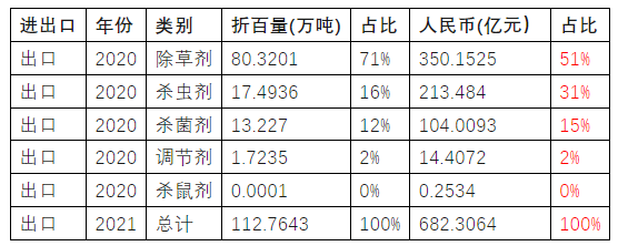 中國農藥以出口為主,進口很少。年平均計算,10年來,農藥出口95.2萬噸,進口2.6萬噸,進口量占總進出口量的2.7%;出口金額529.6億人民幣,進口金額38.1億人民幣,進口額占總進出口額的6.7%。