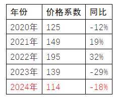 緊接著疫情后的兩年又出現了兩年大跌,其中2023年大跌了29%,2024年又下跌了18%,農藥出口價格系數與2013年2014年持平,一夜回到了10年前。