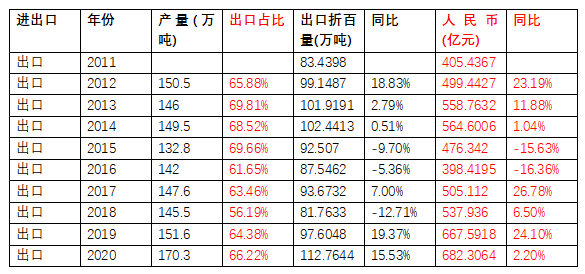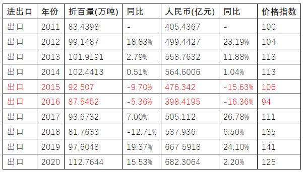 2011—2020年中國農藥進出口數據統計