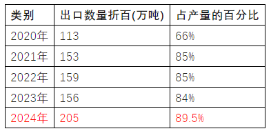 出口已占農藥產量的九成。2024年農藥出口數量達到歷史最高,高達205萬噸,比2023年出口數量多出近50萬噸,同比增長了32%。出口占產量的比重由近3年的85%又提高了5個百分點,達到了近90%。