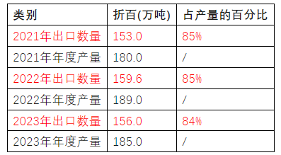 表9 2021—2023年中國農藥出口數量及年度產量分析