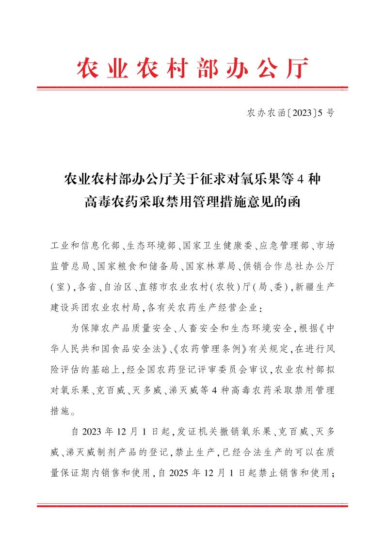 自2023年12月1日起,發證機關撤銷氧樂果、克百威、滅多威、涕滅威制劑產品的登記,禁止生產,已經合法生產的可以在質量保證期內銷售和使用,自2025年12月1日起禁止銷售和使用;僅保留原藥生產企業的原藥生產出口,實施封閉運行監管。