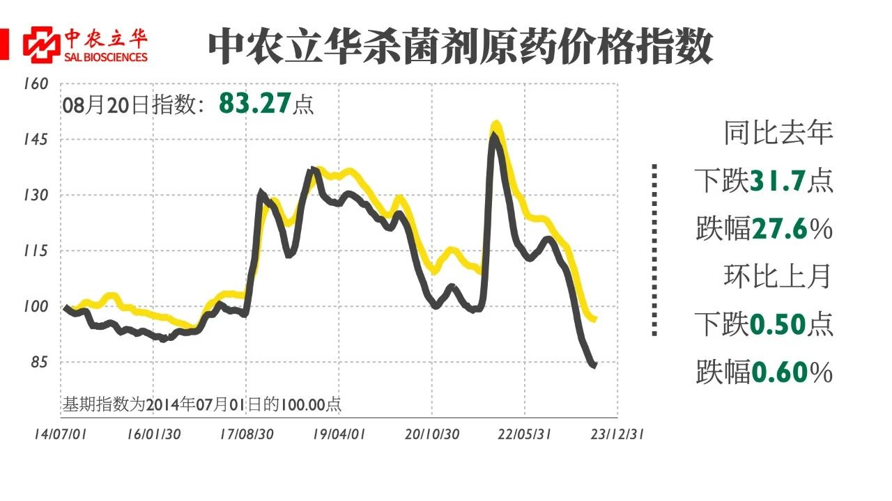 2023年8月20日,中農立華殺菌劑原藥價格指數報83.27點,同比去年大跌27.6%,環比上月跌幅0.60%。殺菌劑市場維持弱勢運行態勢,需求穩定釋放,部分品種廠家開工率降低,原材料價格有所上行,市場關注度及補貨意愿強。