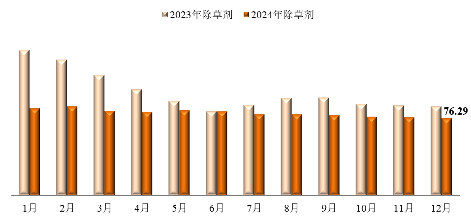 12月,除草劑價格指數(shù)為76.29,環(huán)比下跌0.94%,同比下跌14.03%。監(jiān)測在內(nèi)的36種除草劑產(chǎn)品中,加權(quán)平均成交價格環(huán)比上漲的16種,環(huán)比持平的1種,環(huán)比下跌的19種;加權(quán)平均成交價格同比上漲的4種,同比下跌的32種。