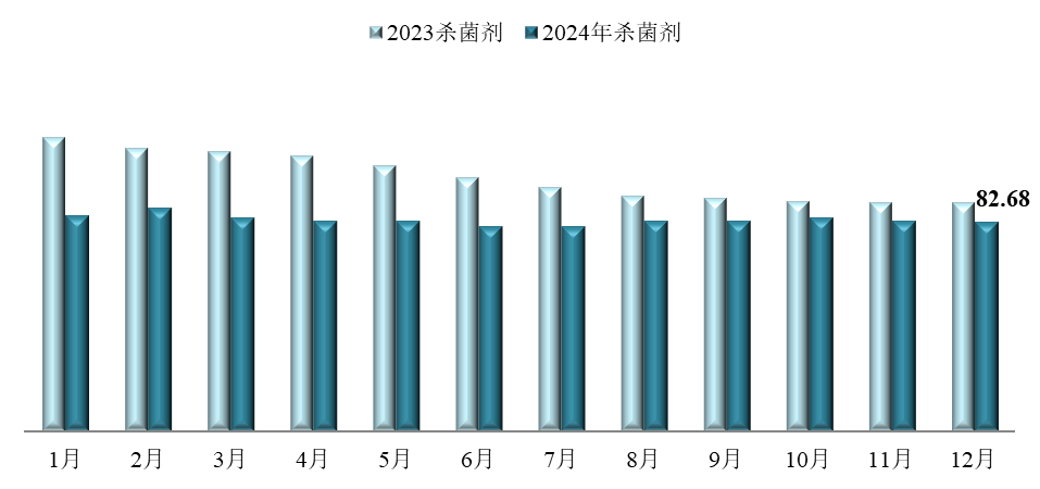 12月,殺菌劑價格指數(shù)為82.68,環(huán)比下跌0.47%,同比下跌8.35%。監(jiān)測在內(nèi)的30種殺菌劑產(chǎn)品中,加權(quán)平均成交價格環(huán)比上漲的14種,環(huán)比持平的2種,環(huán)比下跌的14種;加權(quán)平均成交價格同比上漲的7種,同比持平的1種,同比下跌的22種。